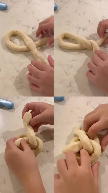 7. Take one end of the rope and cross it with the other end and twist the ends once, then lift the twisted side to cross the rounded side and press down for the pretzel shape. Don't worry if it's not perfect, it will look fine after it's baked.